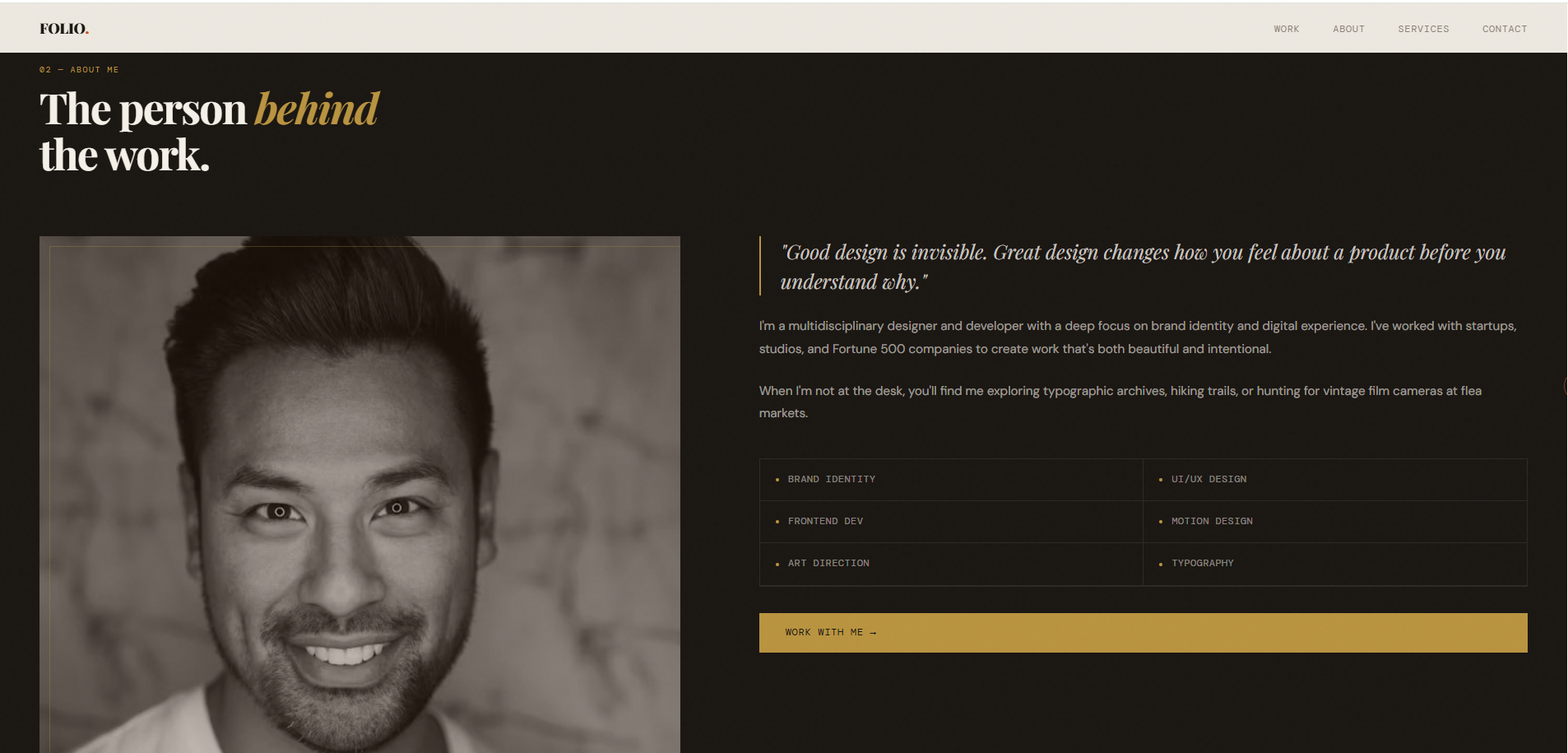 → Sections: Hero · Work · About · Services · Testimonials · Contact